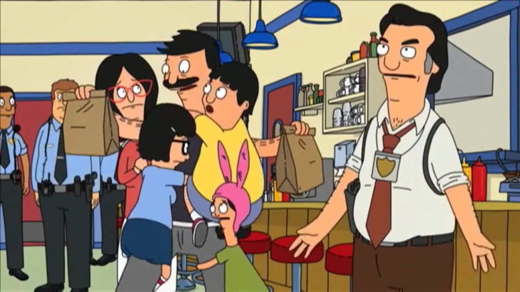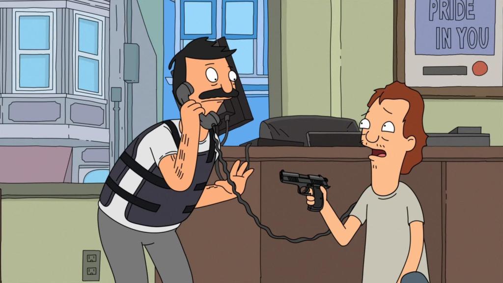 In this episode of “Bob’s Burgers”, the bank across the road from Bob’s restaurant is taken hostage by a robber called Mickey. Bob himself is first sent in as a burger deliveryman for Nicky, but he soon becomes a hostage.